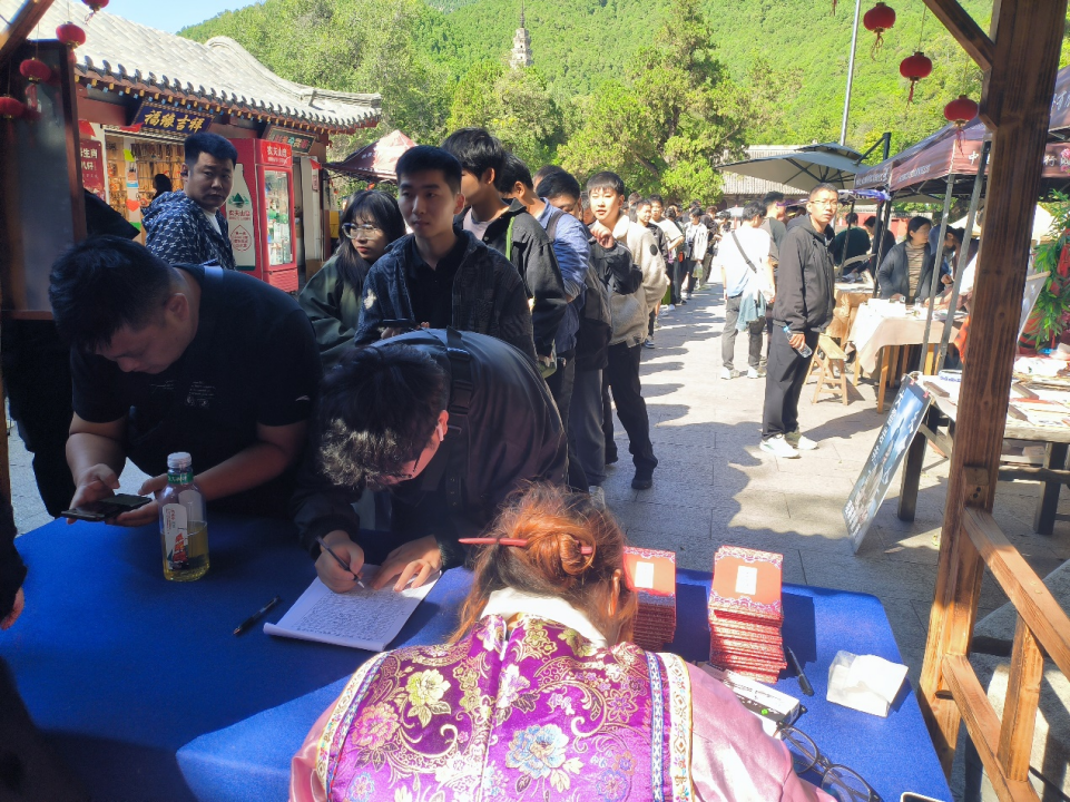 10月1日上(shàng)午,靈岩寺景區(qū)內(nèi)外(wài)熱(rè)鬧非凡。咖啡、冰箱貼、手串、蓋章(zhāng)等帶有“悟空”元素的創意産品随處可(kě)見(jiàn),領取通(tōng)關文牒的長(cháng)隊更是引人(rén)注目。