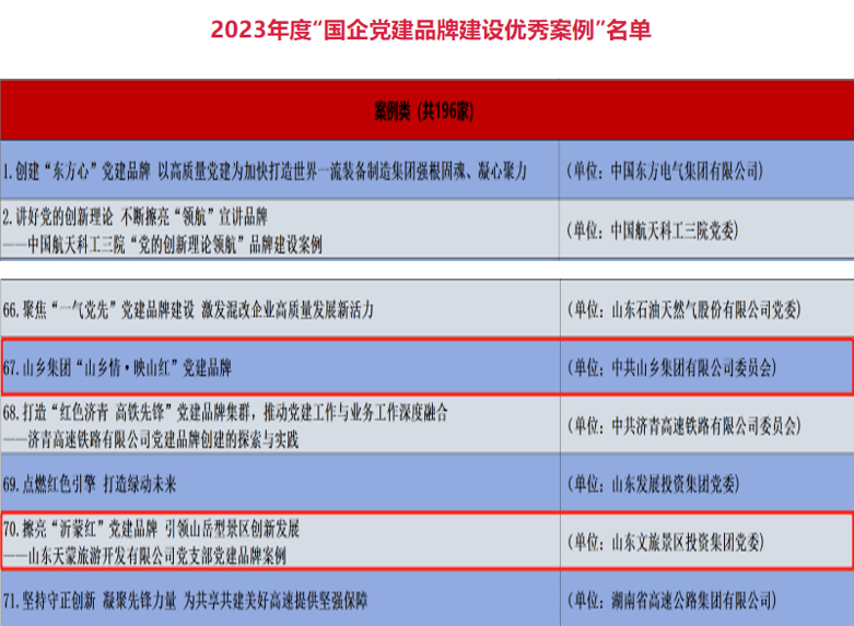 8月9日,由中國(guó)企業改革與發展研究會擔任指導單位、中國(guó)企業管理研究會企業黨建研究院擔任支持單位、《國(guó)企》雜(zá)志主辦的2023年(nián)度“國(guó)企黨建品牌建設優秀案例”征集推選活動圓滿落下(xià)帷幕。經過初步甄選、專家複審,最終全國(guó)有354個案例入選“國(guó)企黨建品牌建設優秀案例”。其中,山(shān)東文旅集團黨委報送的《山(shān)鄉集團“山(shān)鄉情·映山(shān)紅(hóng)”黨建品牌》《擦亮“沂蒙紅(hóng)”黨建品牌引領山(shān)嶽型景區(qū)創新發展——山(shān)東天蒙旅遊開(kāi)發有限公司黨支部黨建品牌案例》2個案例成功入選。