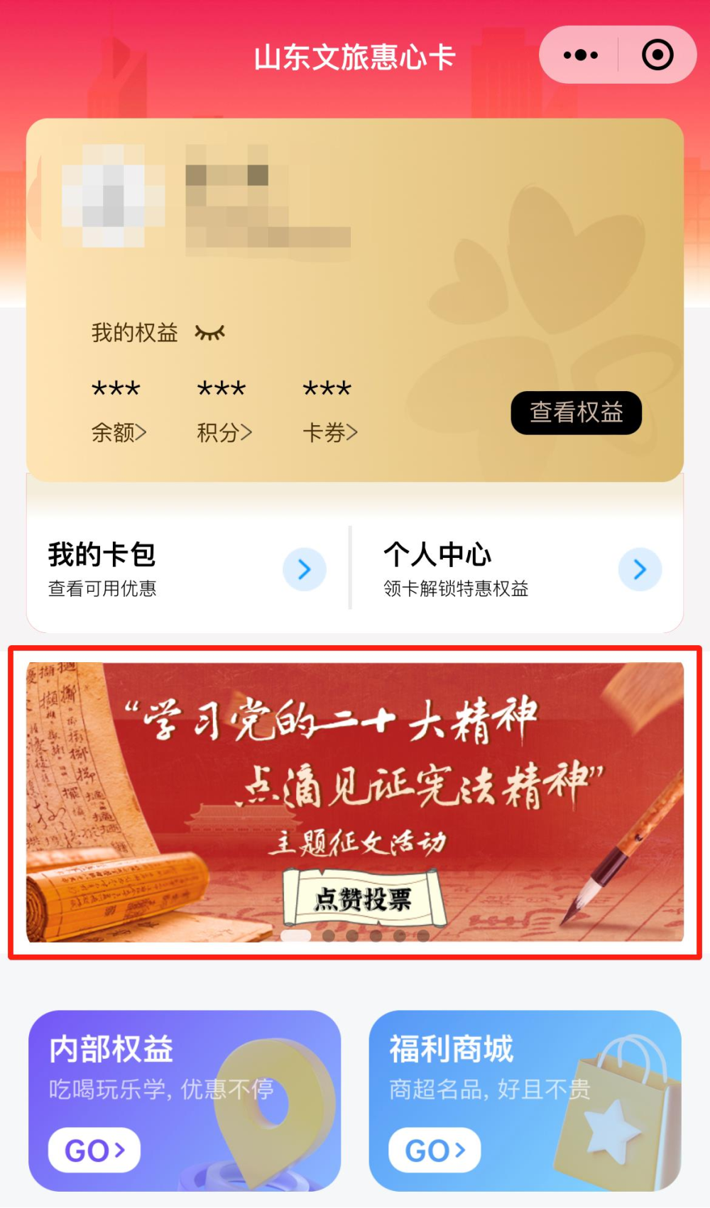 點擊下(xià)圖進入山(shān)東文旅惠心卡小程序,通(tōng)過banner直達活動頁面。
