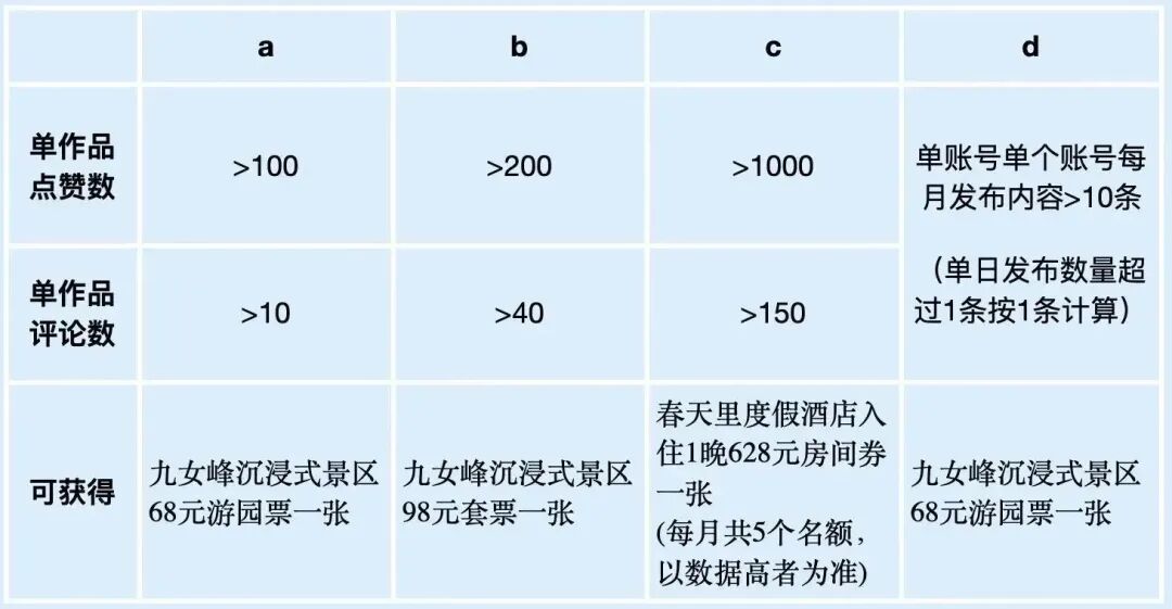 随手拍攝(不限形式:圖文,視(shì)頻(pín)等形式),內(nèi)容包含但(dàn)不限于:春天裏度假酒店及民宿、山(shān)鄉牧野營地(dì)、野有院民宿、九女(nǚ)峰叢林越野俱樂(yuè)部、九女(nǚ)峰沉浸式景區(qū)這(zhè)些業态,積極正能(néng)量,推廣宣傳九女(nǚ)峰度假區(qū)。