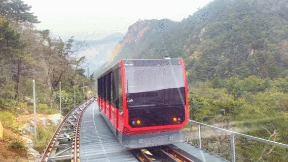 乘着紅(hóng)色山(shān)口列車十分鐘(zhōng)到達山(shān)頂