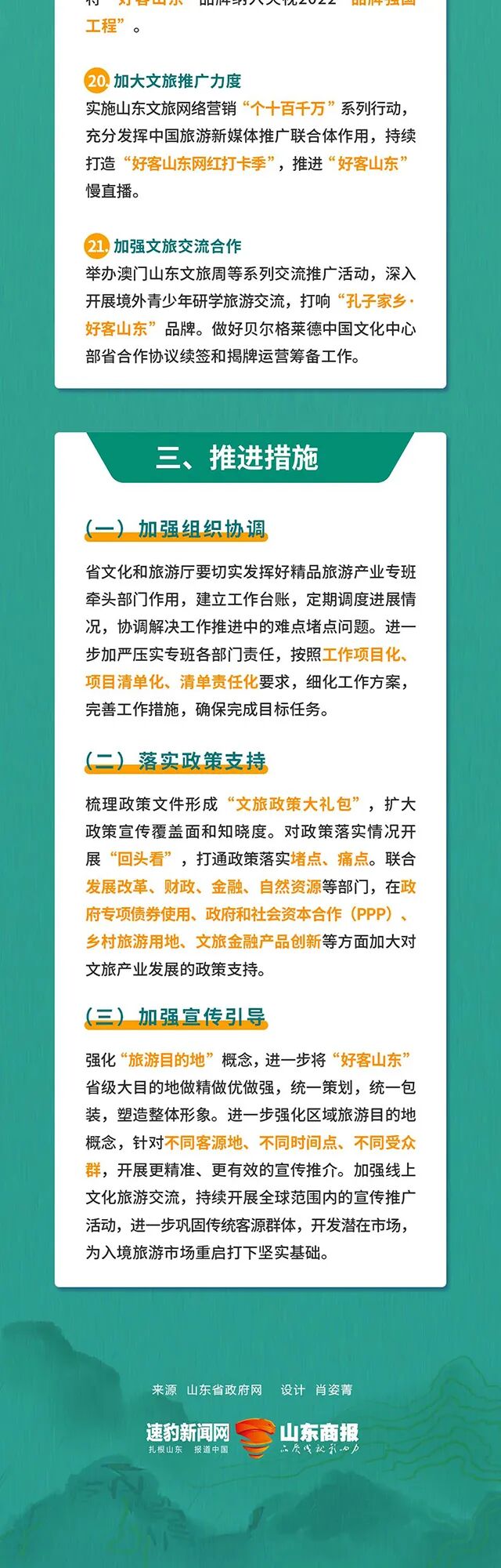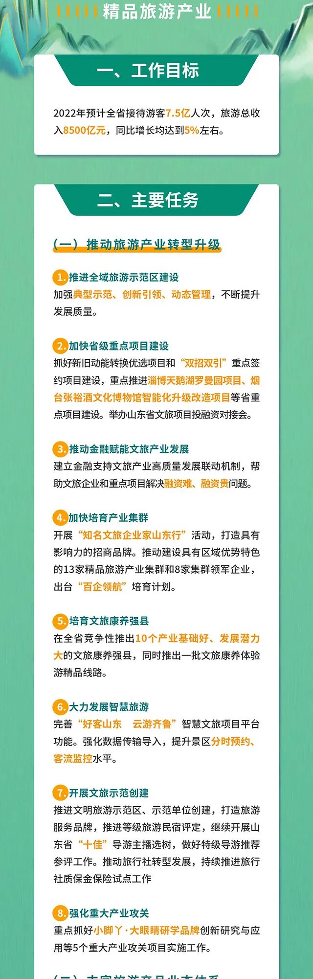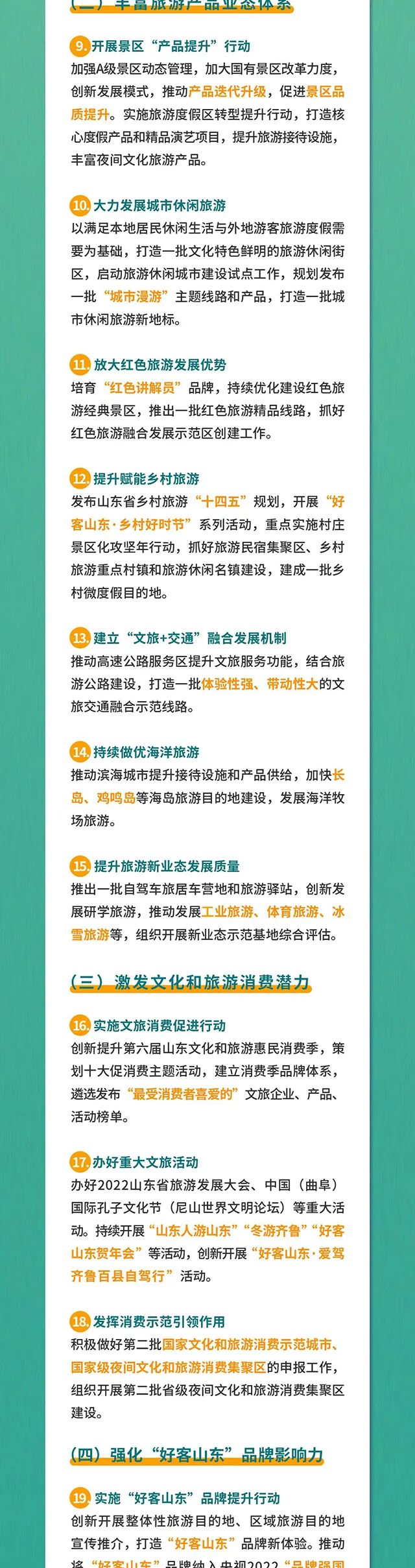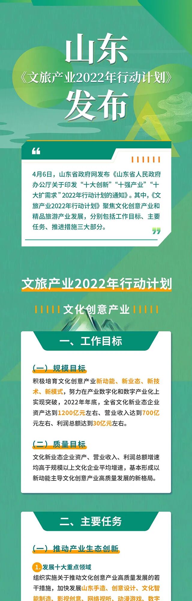 4月6日,山(shān)東省政府網發布《山(shān)東省人(rén)民政府辦公廳關于印發“十大創新”“十強産業”“十大擴需求”2022年(nián)行(xíng)動計劃的通(tōng)知》。其中,《文旅産業2022年(nián)行(xíng)動計劃》聚焦文化創意産業和(hé)精品旅遊産業發展,分别包括工(gōng)作(zuò)目标、主要(yào)任務、推進措施三大部分。