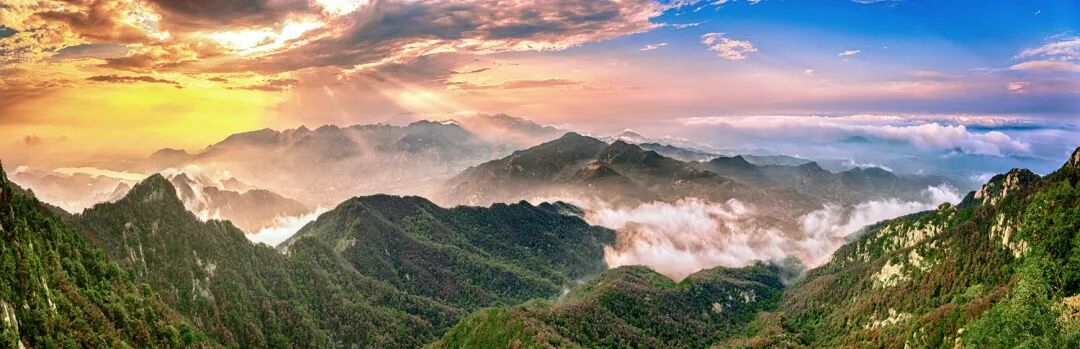 八月,陽光(guāng)透過稀疏的雲層,灑在山(shān)巒之上(shàng),山(shān)間(jiān)雲海(hǎi)翻騰,葉脈輪廓邊緣淡淡的黃(huáng)色與翠綠(lǜ)交織在一(yī)起。